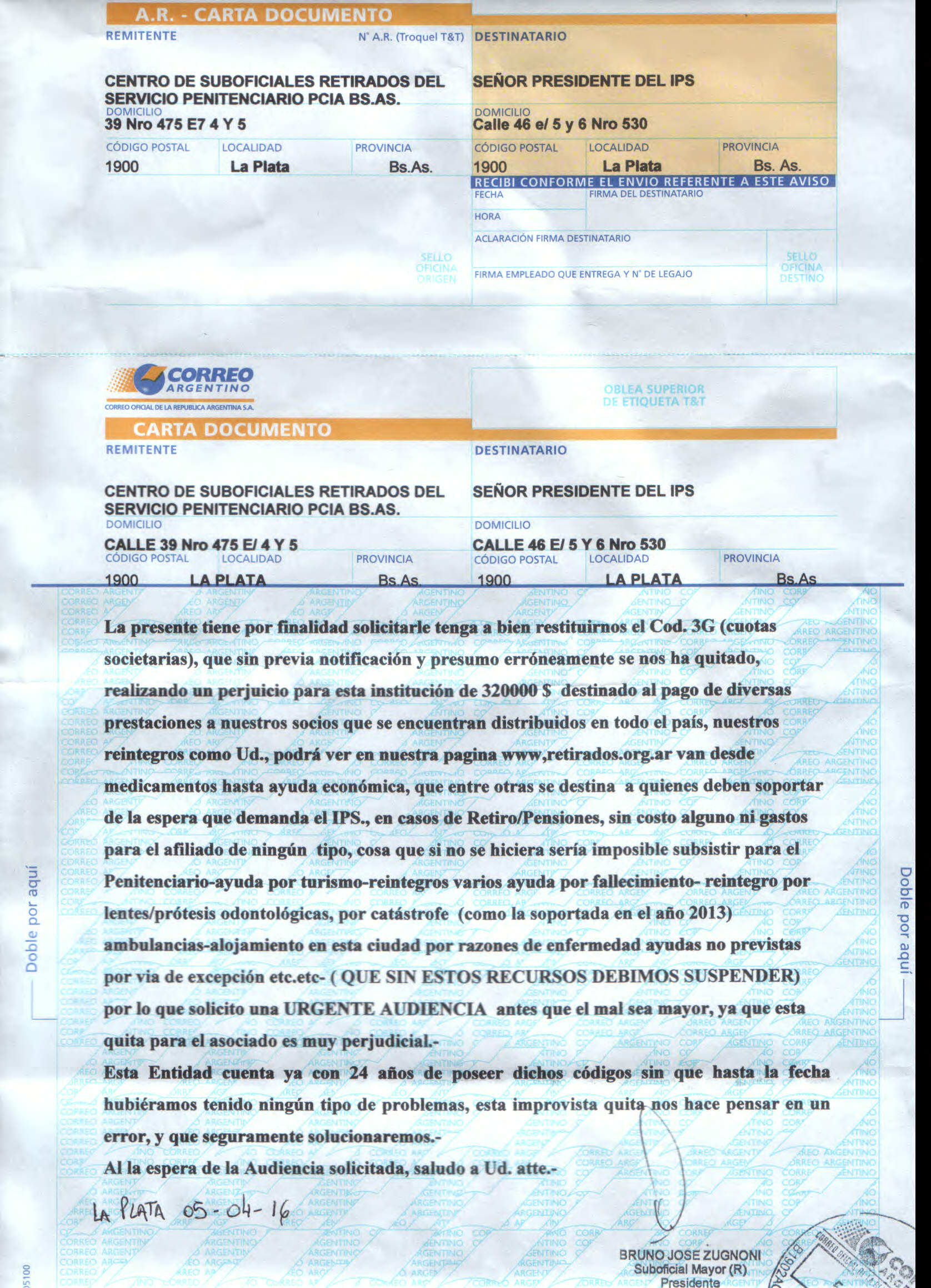 Ante la falta de respuestas, hemos enviado una carta documento, con el fin de que se nos comunique que resolución adoptará ante la puesta en marcha del nuevo coseguro penitenciario