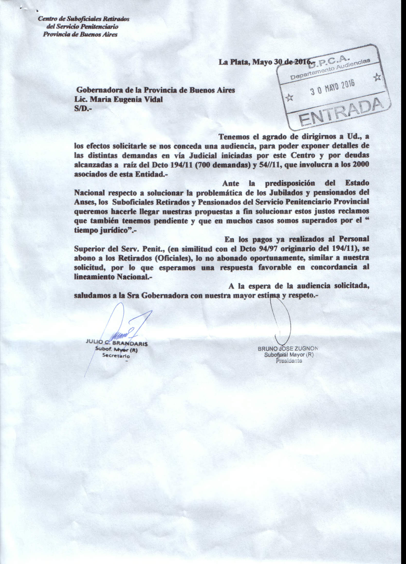 En la fecha hemos enviado sendas notas al Gobernador y Ministro de Justicia de la Pcia. a los efectos de que se enmiende el error en la escala salarial, en la cual están mal encasillados los Suboficiales Administrativos, Tecnicos y Auxiliares.